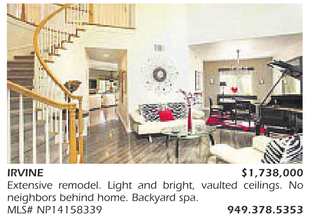 IRVINE $1,738,000 Extensive remodel. Light and bright, vaulted ceilings. No neighbors behind home. Backyard spa. MLS# NP14158339 949.378.5353