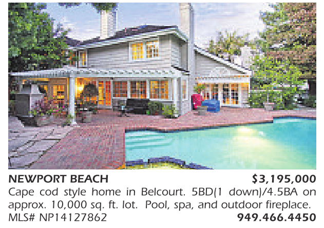NEWPORT BEACH $3,195,000 Cape cod style home in Belcourt. 5BD(1 down)/4.5BA on approx. 10,000 sq. ft. lot. Pool, spa, and outdoor fireplace. MLS# NP14127862 949.466.4450