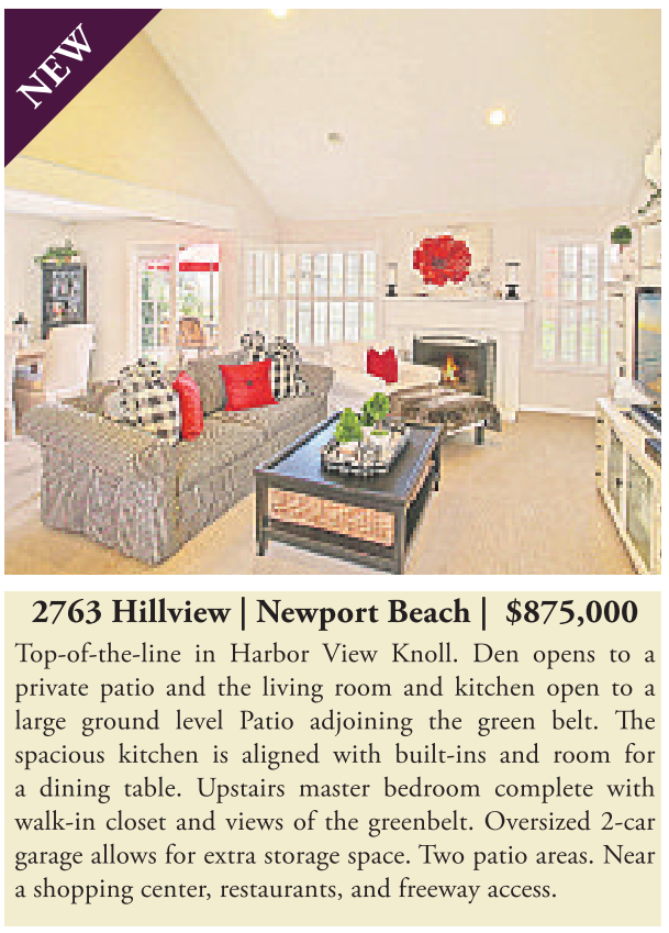 2763 Hillview | Newport Beach | $875,000 Top-of-the-line in Harbor View Knoll. Den opens to a private patio and the living room and kitchen open to a large ground level Patio adjoining the green belt. The spacious kitchen is aligned with built-ins and room for a dining table. Upstairs master bedroom complete with walk-in closet and views of the greenbelt. Oversized 2-car garage allows for extra storage space. Two patio areas. Near a shopping center, restaurants, and freeway access.