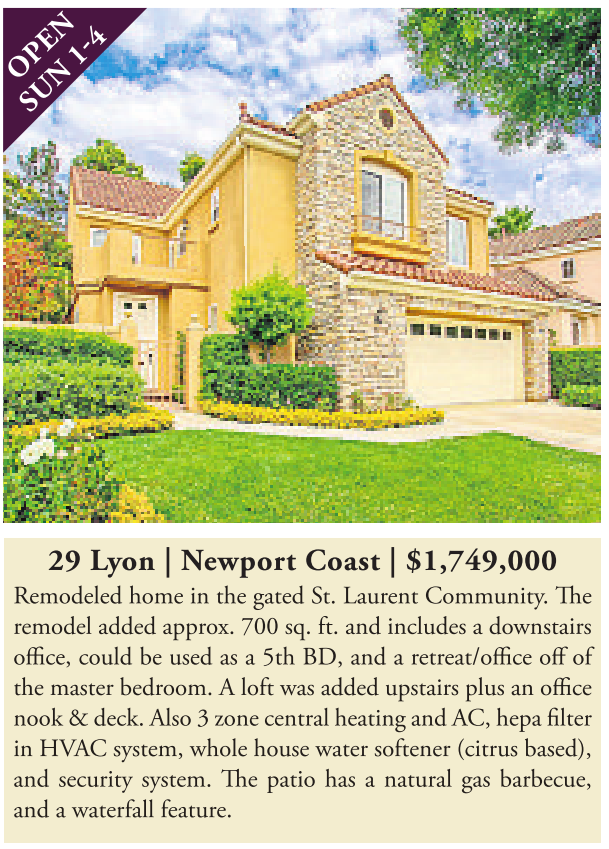 29 Lyon | Newport Coast | $1,749,000 Remodeled home in the gated St. Laurent Community. The remodel added approx. 700 sq. ft. and includes a downstairs office, could be used as a 5th BD, and a retreat/office off of the master bedroom. A loft was added upstairs plus an office nook &deck. Also 3zone central heating and AC,hepa filter in HVAC system, whole house water softener (citrus based), and security system. The patio has a natural gas barbecue, and a waterfall feature.
