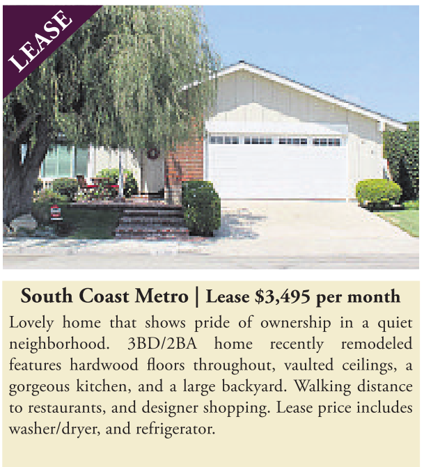 South Coast Metro | Lease $3,495 per month Lovely home that shows pride of ownership in a quiet neighborhood. 3BD/2BA home recently remodeled features hardwood floors throughout, vaulted ceilings, a gorgeous kitchen, and a large backyard. Walking distance to restaurants, and designer shopping. Lease price includes washer/dryer, and refrigerator.