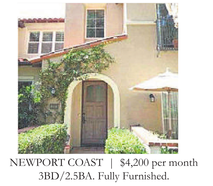 NEWPORT COAST | $4,200 per month 3BD/2.5BA. Fully Furnished.