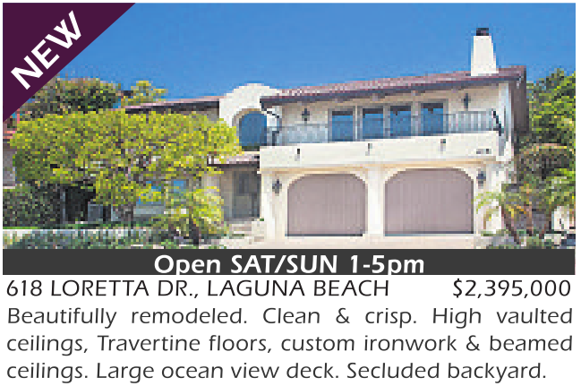 Open SAT/SUN 1-5pm 618 LORETTA DR., LAGUNA BEACH $2,395,000 Beautifully remodeled. Clean & crisp. High vaulted ceilings, Travertine floors, custom ironwork & beamed ceilings. Large ocean view deck. Secluded backyard.