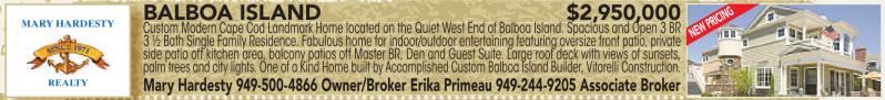 MARY HARDESTY REALTY BALBOA ISLAND $2,950,000 B Custom Modern Cape Cod Landmark Home located on the Quiet West End of Balboa Island. Spacious and Open 3 BR Custom Modern Cape Cod Landmark Home located on the Quiet West End of Balboa Island. Spacious and Open 3 BR 3½Bath Single Family Residence.Fabulous home forindoor/outdoor entertaining featuring oversizefront patio,private private side patio off kitchen area, balcony patios off Master BR, Den and Guest Suite. Large roof deck with views of sunsets, ppalm trees andcitylights. OneofaKindHome builtbyAccomplishedCustomBalboa IslandBuilder,Vitarelli Construction. Mary Hardesty 949-500-4866 Owner/Broker Erika Primeau 949-244-9205 Associate Broker