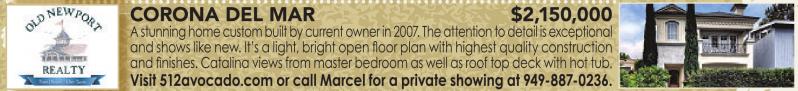 CORONA DEL MAR $2,150,000 Astunning home custom builtbycurrent ownerin2007. Theattention to detail is exceptional and shows like new. It’s a light, bright open floor plan with highest quality construction and finishes. Catalina views from master bedroom as well as roof top deck with hot tub. Visit 512avocado.com or call Marcel for a private showing at 949-887-0236.