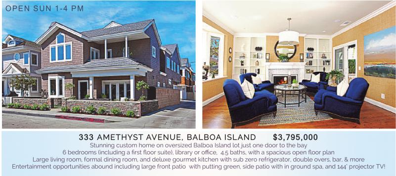 OPEN SUN 1-4 PM 333 AMETHYST AVENUE, BALBOA ISLAND $3,795,000 Stunning custom home on oversized Balboa Island lot just one door to the bay 6 bedrooms (including a first floor suite), library or office, 4.5 baths, with a spacious open floor plan Large living room, formal dining room, and deluxe gourmet kitchen with sub zero refrigerator, double overs, bar, & more Entertainment opportunities abound including large front patio with putting green, side patio with in ground spa, and 144’ projector TV!