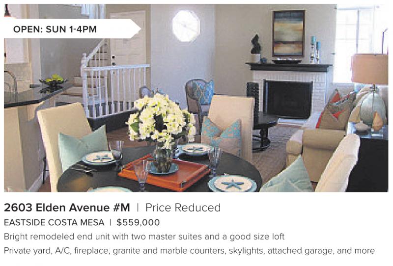 OPEN: SUN 1-4PM 2603 Elden Avenue #M | Price Reduced EASTSIDE COSTA MESA | $559,000 Bright remodeled end unit with two master suites and a good size loft Private yard, A/C, fireplace, granite and marble counters, skylights, attached garage, and more See also