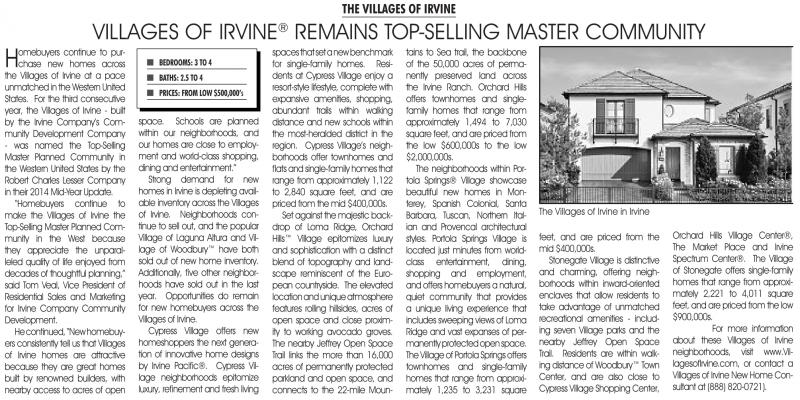 unmatched in the Western United States. For the third consecutive year, the Villages of Irvine - built by the Irvine Company’s Community Development Company - was named the Top-Selling Master Planned Community in the Western United States by the Robert Charles Lesser Company in their 2014 Mid-Year Update.