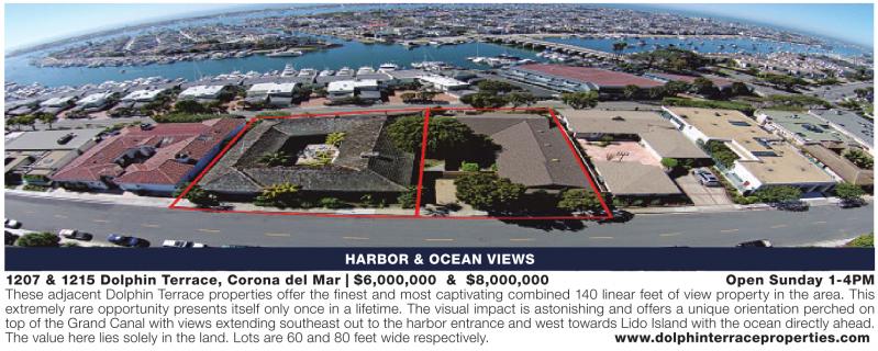 HARBOR & OCEAN VIEWS 1207 & 1215 Dolphin Terrace, Corona del Mar | $6,000,000 & $8,000,000 Open Sunday 1-4PM These adjacent Dolphin Terrace properties offer the finest and most captivating combined 140 linear feet of view property in the area. This extremely rare opportunity presents itself only once in a lifetime. The visual impact is astonishing and offers a unique orientation perched on top of the Grand Canal with views extending southeast out to the harbor entrance and west towards Lido Island with the ocean directly ahead. The value here lies solely in the land. Lots are 60 and 80 feet wide respectively. www.dolphinterraceproperties.com See also