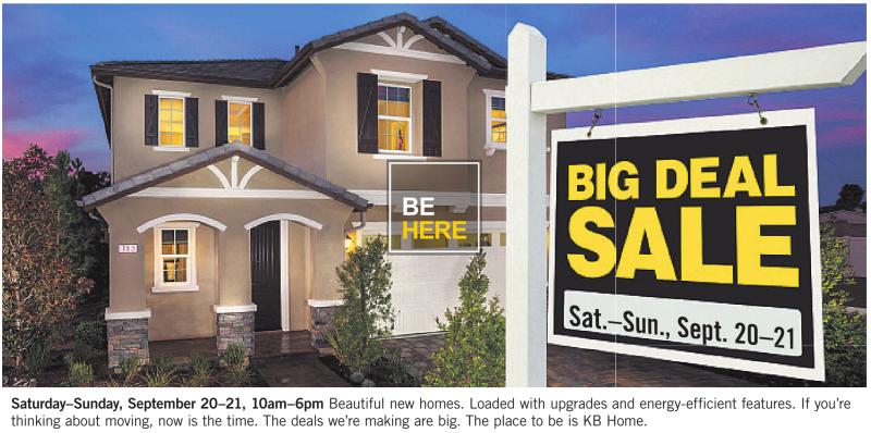 Saturday–Sunday, September 20–21, 10am–6pm Beautiful new homes. Loaded with upgrades and energy-efficient features. If you’re thinking about moving, now is the time. The deals we’re making are big. The place to be is KB Home.