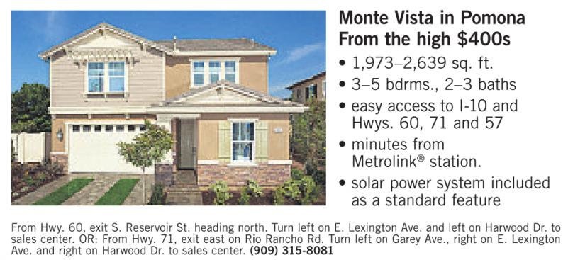 Monte Vista in Pomona From the high $400s • 1,973–2,639 sq. ft. • 3–5 bdrms., 2–3 baths • easy access to I-10 and Hwys. 60, 71 and 57 • minutes from Metrolink ® station. • solar power system included as a standard feature From Hwy. 60, exit S. Reservoir St. heading north. Turn left on E. Lexington Ave. and left on Harwood Dr. to sales center. OR: From Hwy. 71, exit east on Rio Rancho Rd. Turn left on Garey Ave., right on E. Lexington Ave. and right on Harwood Dr. to sales center. (909) 315-8081