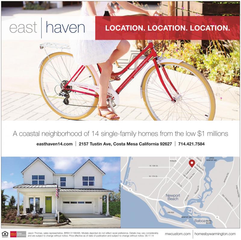 LOCATION. LOCATION. LOCATION. A coastal neighborhood of 14 single-family homes from the low $1 millions easthaven14.com | 2157 Tustin Ave, Costa Mesa California 92627 | 714.421.7584 W. BaySt. UPPER NEWPORT BAY W. 19th St. 1 Newport Beach LIDO ISLE NEWPORT BAY Balboa BALBOA ISLAND 1 Jason Thomas, sales representative, BRE# 01166495. Models depicted do not reflect racial preference. Details may vary considerably and are subject to change without notice. Price effective as of date of publication and subject to change without notice. 09.17.14 mwcustom.com homesbywarmington.com