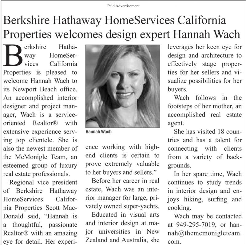 Wach may be contacted at 949-295-7019, or hannah@themcmonigleteam. com.