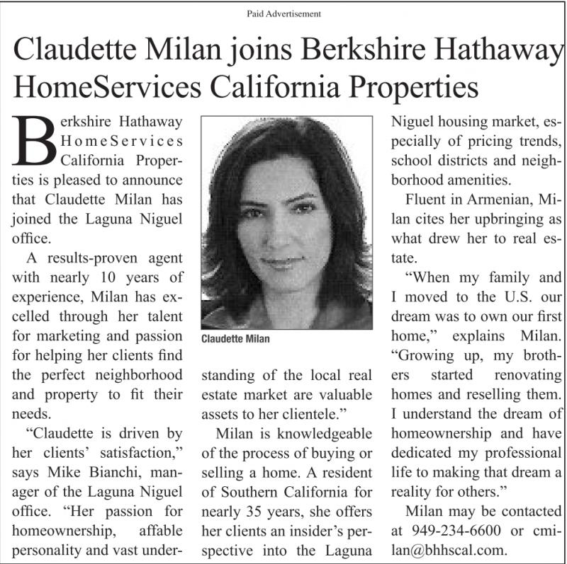 Paid Advertisement Claudette Milan joins Berkshire Hathaway HomeServices California Properties Claudette Milan Berkshire Hathaway HomeServices California Properties is pleased to announce that Claudette Milan has joined the Laguna Niguel office. A results-proven agent with nearly 10 years of experience, Milan has excelled through her talent for marketing and passion for helping her clients find the perfect neighborhood and property to fit their needs. “Claudette is driven by her clients’ satisfaction,” says Mike Bianchi, manager of the Laguna Niguel office. “Her passion for homeownership, affable personality and vast under standing of the local real estate market are valuable assets to her clientele.” Milan is knowledgeable of the process of buying or selling a home. A resident of Southern California for nearly 35 years, she offers her clients an insider’s perspective into the Laguna Niguel housing market, especially of pricing trends, school districts and neighborhood amenities. Fluent in Armenian, Milan cites her upbringing as what drew her to real estate. “When my family and I moved to the U.S. our dream was to own our first home,” explains Milan. “Growing up, my brothers started renovating homes and reselling them. I understand the dream of homeownership and have dedicated my professional life to making that dream a reality for others.” Milan may be contacted at 949-234-6600 or cmilan@bhhscal.com.