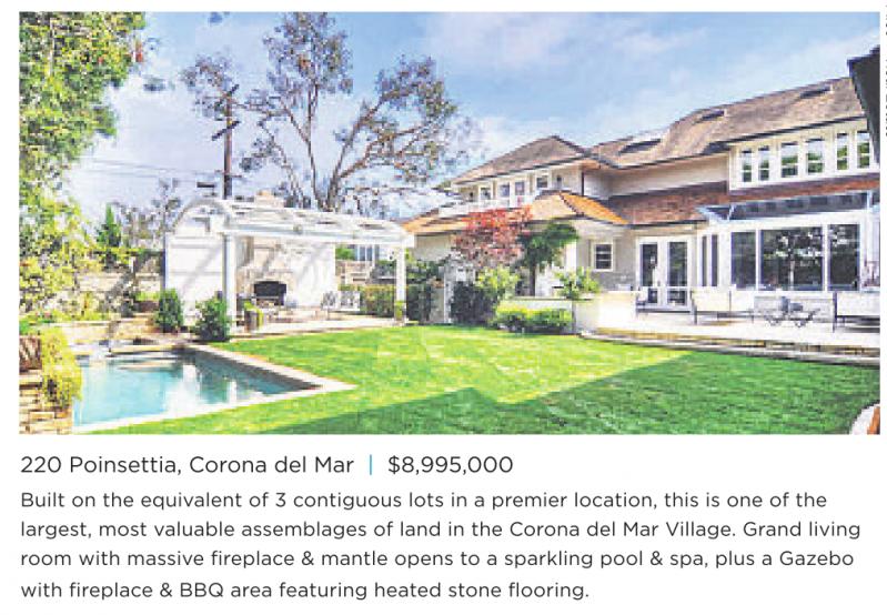 220 Poinsettia, Corona del Mar | $8,995,000 Built on the equivalent of 3 contiguous lots in a premier location, this is one of the largest, most valuable assemblages of land in the Corona del Mar Village. Grand living room with massive fireplace & mantle opens to a sparkling pool & spa, plus a Gazebo with fireplace & BBQ area featuring heated stone flooring.