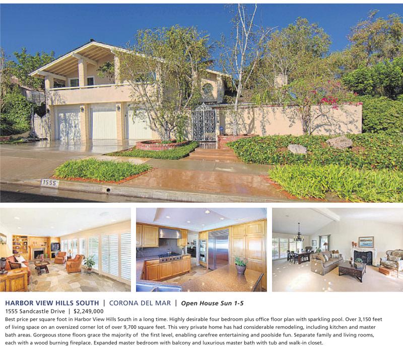 HARBOR VIEW HILLS SOUTH | CORONA DEL MAR | Open House Sun 1-5 1555 Sandcastle Drive | $2,249,000 Best price per square foot in Harbor View Hills South in a long time. Highly desirable four bedroom plus office floor plan with sparkling pool. Over 3,150 feet of living space on an oversized corner lot of over 9,700 square feet. This very private home has had considerable remodeling, including kitchen and master bath areas. Gorgeous stone floors grace the majority of the first level, enabling carefree entertaining and poolside fun. Separate family and living rooms, each with a wood burning fireplace. Expanded master bedroom with balcony and luxurious master bath with tub and walk-in closet. See also