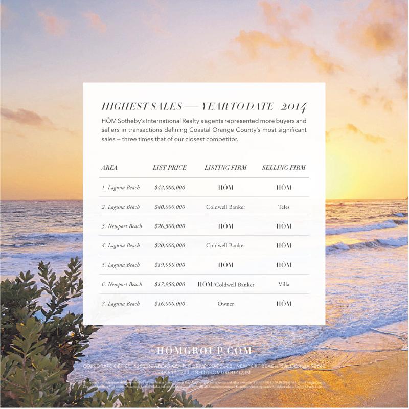 The information included on these pages is based on information from California Regional Multiple Listing Service and other sources as of [01.01.2014 –09.10.2014] for Coastal Orange County. Display of data from MLS and other sources is deemed reliable but not guaranteed accurate by theMLS and other sources. This representation represents the highest sales in Coastal Orange County.