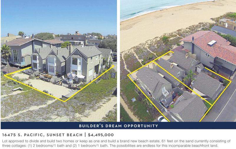 BUILDER'S DREAM OPPORTUNITY 16475 S. PACIFIC, SUNSET BEACH | $4,495,000 Lot approved to divide and build two homes or keep as one and build a brand new beach estate. 61 feet on the sand currently consisting of three cottages: (1) 2 bedrooms/1 bath and (2) 1 bedroom/1 bath. The possibilities are endless for this incomparable beachfront land.