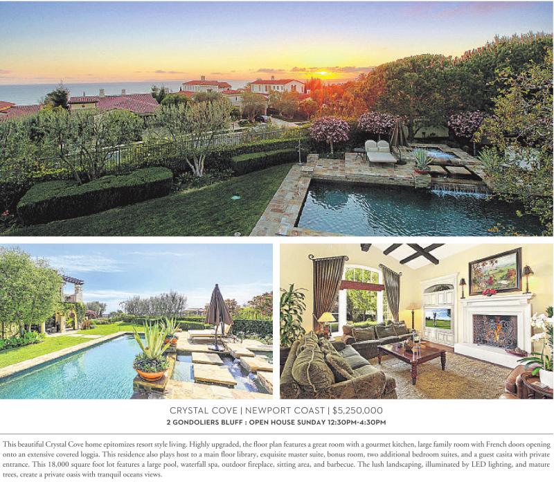 CRYSTAL COVE | NEWPORT COAST | $5,250,000 2 GONDOLIERS BLUFF : OPEN HOUSE SUNDAY 12:30PM-4:30PM This beautiful Crystal Cove home epitomizes resort style living. Highly upgraded, the floor plan features a great room with a gourmet kitchen, large family room with French doors opening onto an extensive covered loggia. This residence also plays host to a main floor library, exquisite master suite, bonus room, two additional bedroom suites, and a guest casita with private entrance. This 18,000 square foot lot features a large pool, waterfall spa, outdoor fireplace, sitting area, and barbecue. The lush landscaping, illuminated by LED lighting, and mature trees, create a private oasis with tranquil oceans views.
