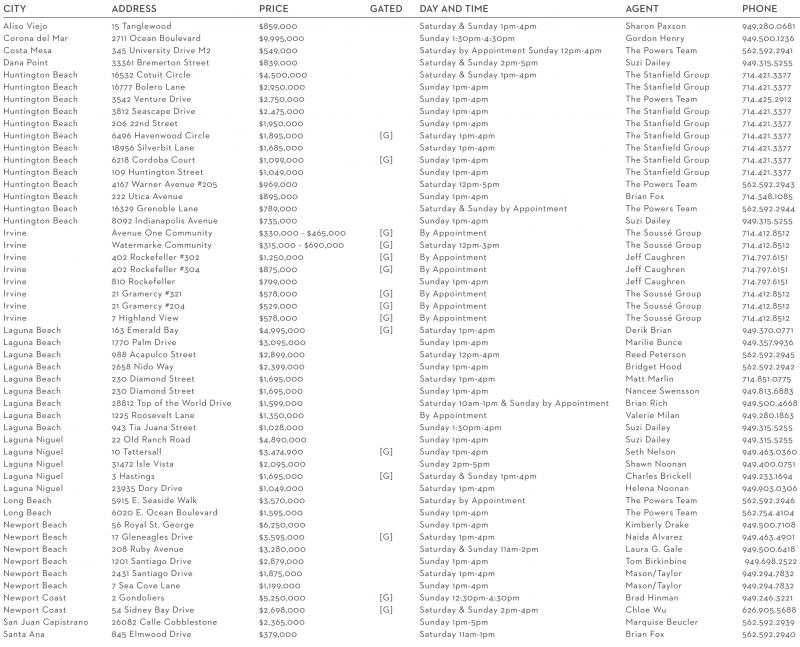 CITY ADDRESS PRICE GATED DAY AND TIME AGENT PHONE Aliso Viejo 15 Tanglewood $859,000 Saturday & Sunday 1pm-4pm Sharon Paxson 949.280.0681 Corona del Mar 2711 Ocean Boulevard $9,995,000 Sunday 1:30pm-4:30pm Gordon Henry 949.500.1236 Costa Mesa 345 University Drive M2 $549,000 Saturday by Appointment Sunday 12pm-4pm The Powers Team 562.592.2941 Dana Point 33361 Bremerton Street $839,000 Saturday & Sunday 2pm-5pm Suzi Dailey 949.315.5255 Huntington Beach 16532 Cotuit Circle $4,500,000 Saturday & Sunday 1pm-4pm The Stanfield Group 714.421.3377 Huntington Beach 16777 Bolero Lane $2,950,000 Sunday 1pm-4pm The Stanfield Group 714.421.3377 Huntington Beach 3542 Venture Drive $2,750,000 Sunday 1pm-4pm The Powers Team 714.425.2912 Huntington Beach 3812 Seascape Drive $2,475,000 Sunday 1pm-4pm The Stanfield Group 714.421.3377 Huntington Beach 206 22nd Street $1,950,000 Sunday 1pm-4pm The Stanfield Group 714.421.3377 Huntington Beach 6496 Havenwood Circle $1,895,000 [G] Saturday 1pm-4pm The Stanfield Group 714.421.3377 Huntington Beach 18956 Silverbit Lane $1,685,000 Saturday 1pm-4pm The Stanfield Group 714.421.3377 Huntington Beach 6218 Cordoba Court $1,099,000 [G] Sunday 1pm-4pm The Stanfield Group 714.421.3377 Huntington Beach 109 Huntington Street $1,049,000 Sunday 1pm-4pm The Stanfield Group 714.421.3377 Huntington Beach 4167 Warner Avenue #205 $969,000 Saturday 12pm-5pm The Powers Team 562.592.2943 Huntington Beach 222 Utica Avenue $895,000 Sunday 1pm-4pm Brian Fox 714.348.1085 Huntington Beach 16329 Grenoble Lane $789,000 Saturday & Sunday by Appointment The Powers Team 562.592.2944 Huntington Beach 8092 Indianapolis Avenue $735,000 Sunday 1pm-4pm Suzi Dailey 949.315.5255 Irvine Avenue One Community $330,000 - $465,000 [G] By Appointment The Soussé Group 714.412.8512 Irvine Watermarke Community $315,000 - $690,000 [G] Saturday 12pm-3pm The Soussé Group 714.412.8512 Irvine 402 Rockefeller #302 $1,250,000 [G] By Appointment Jeff Caughren 714.797.6151 Irvine 402 Rockefeller #304 $875,000 [G] By Appointment Jeff Caughren 714.797.6151 Irvine 810 Rockefeller $799,000 Sunday 1pm-4pm Jeff Caughren 714.797.6151 Irvine 21 Gramercy #321 $578,000 [G] By Appointment The Soussé Group 714.412.8512 Irvine 21 Gramercy #204 $529,000 [G] By Appointment The Soussé Group 714.412.8512 Irvine 7 Highland View $578,000 [G] By Appointment The Soussé Group 714.412.8512 Laguna Beach 163 Emerald Bay $4,995,000 [G] Saturday 1pm-4pm Derik Brian 949.370.0771 Laguna Beach 1770 Palm Drive $3,095,000 Sunday 1pm-4pm Marilie Bunce 949.357.9936 Laguna Beach 988 Acapulco Street $2,899,000 Saturday 12pm-4pm Reed Peterson 562.592.2945 Laguna Beach 2658 Nido Way $2,399,000 Sunday 1pm-4pm Bridget Hood 562.592.2942 Laguna Beach 230 Diamond Street $1,695,000 Saturday 1pm-4pm Matt Marlin 714.851.0775 Laguna Beach 230 Diamond Street $1,695,000 Sunday 1pm-4pm Nancee Swensson 949.813.6883 Laguna Beach 28812 Top of the World Drive $1,599,000 Saturday 10am-1pm & Sunday by Appointment Brian Rich 949.500.4668 Laguna Beach 1225 Roosevelt Lane $1,350,000 By Appointment Valerie Milan 949.280.1863 Laguna Beach 943 Tia Juana Street $1,028,000 Sunday 1:30pm-4pm Suzi Dailey 949.315.5255 Laguna Niguel 22 Old Ranch Road $4,890,000 Sunday 1pm-4pm Suzi Dailey 949.315.5255 Laguna Niguel 10 Tattersall $3,474,900 [G] Sunday 1pm-4pm Seth Nelson 949.463.0360 Laguna Niguel 31472 Isle Vista $2,095,000 Sunday 2pm-5pm Shawn Noonan 949.400.0751 Laguna Niguel 3 Hastings $1,695,000 [G] Saturday & Sunday 1pm-4pm Charles Brickell 949.233.1694 Laguna Niguel 23935 Dory Drive $1,049,000 Saturday 1pm-4pm Helena Noonan 949.903.0306 Long Beach 5915 E. Seaside Walk $3,570,000 Saturday by Appointment The Powers Team 562.592.2946 Long Beach 6020 E. Ocean Boulevard $1,595,000 Sunday 1pm-4pm The Powers Team 562.754.4104 Newport Beach 56 Royal St. George $6,250,000 Sunday 1pm-4pm Kimberly Drake 949.500.7108 Newport Beach 17 Gleneagles Drive $3,595,000 [G] Saturday 1pm-4pm Naida Alvarez 949.463.4901 Newport Beach 208 Ruby Avenue $3,280,000 Saturday & Sunday 11am-2pm Laura G. Gale 949.500.6418 Newport Beach 1201 Santiago Drive $2,879,000 Sunday 1pm-4pm Tom Birkinbine 949.698.2522 Newport Beach 2431 Santiago Drive $1,875,000 Saturday 1pm-4pm Mason/Taylor 949.294.7832 Newport Beach 7 Sea Cove Lane $1,199,000 Sunday 1pm-4pm Mason/Taylor 949.294.7832 Newport Coast 2 Gondoliers $5,250,000 [G] Sunday 12:30pm-4:30pm Brad Hinman 949.246.3221 Newport Coast 54 Sidney Bay Drive $2,698,000 [G] Saturday & Sunday 2pm-4pm Chloe Wu 626.905.5688 San Juan Capistrano 26082 Calle Cobblestone $2,365,000 Sunday 1pm-5pm Marquise Beucler 562.592.2939 Santa Ana 845 Elmwood Drive $379,000 Saturday 11am-1pm Brian Fox 562.592.2940