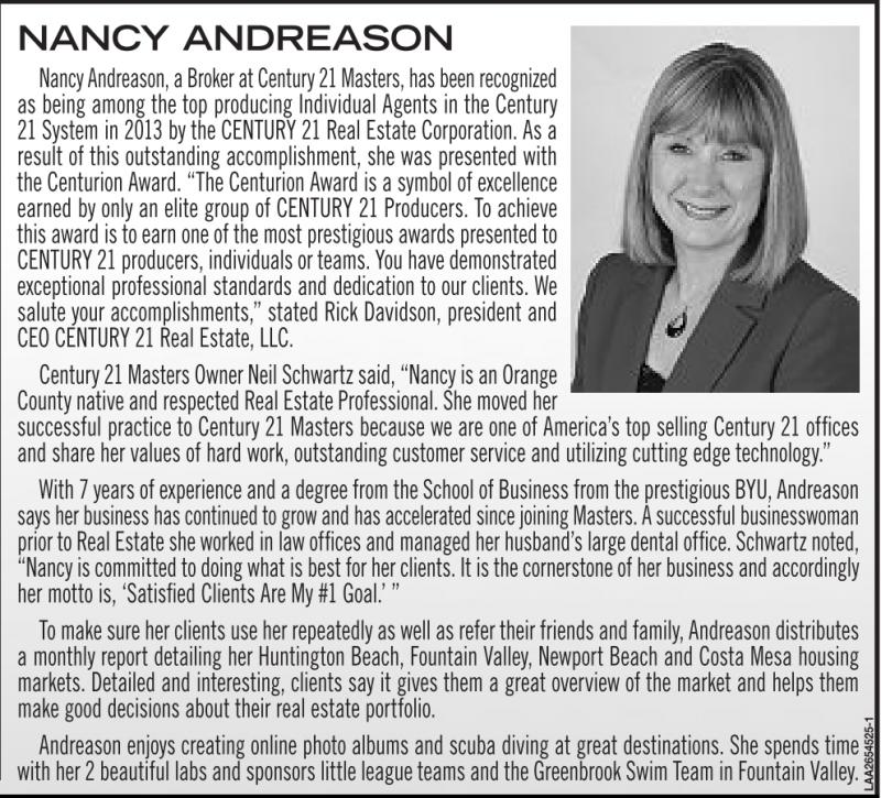 NANCY ANDREASON NancyAndreason,aBrokeratCentury 21 Masters, hasbeenrecognized as being among the top producing Individual Agents in the Century 21 System in 2013 by the CENTURY 21 Real Estate Corporation. As a result of this outstanding accomplishment, she was presented with the Centurion Award. “The Centurion Award is a symbol of excellence earned by only an elite group of CENTURY 21 Producers. To achieve this awardistoearnone of themostprestigiousawardspresented to CENTURY21producers,individualsorteams.You havedemonstrated exceptional professional standards and dedication to our clients. We salute your accomplishments,” stated Rick Davidson, president and CEO CENTURY 21 Real Estate, LLC. Century21Masters OwnerNeilSchwartzsaid, “Nancy is an Orange County native andrespected Real Estate Professional.She movedher successful practice to Century 21 Masters because we are one of America’s top selling Century 21 offices and share her values of hard work, outstanding customer service and utilizing cutting edge technology.” With 7years of experience andadegree from theSchoolofBusinessfromthe prestigiousBYU,Andreason says herbusinesshas continuedtogrowand hasacceleratedsince joiningMasters.Asuccessfulbusinesswoman priortoRealEstate sheworkedinlaw offices andmanaged herhusband’slarge dental office. Schwartznoted, “Nancy is committed to doingwhatisbestfor her clients. It is thecornerstone of her business andaccordingly her motto is, ‘Satisfied Clients Are My #1 Goal.’ ” To make sure herclients useher repeatedlyaswellasrefer theirfriends andfamily, Andreasondistributes a monthly report detailing her Huntington Beach, Fountain Valley, Newport Beach and Costa Mesa housing markets. Detailed and interesting, clients say it gives them a great overview of the market and helps them make good decisions about their real estate portfolio. Andreason enjoys creating online photo albums and scuba diving at great destinations. She spends time with her2beautiful labs andsponsorslittleleagueteams andthe GreenbrookSwimTeaminFountainValley.