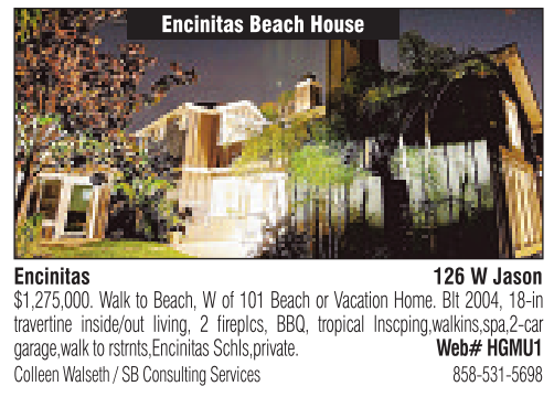 Encinitas Beach House Encinitas 126 WJason $1,275,000. Walk to Beach, Wof101 Beach or Vacation Home. Blt 2004, 18-in travertine inside/out living, 2 fireplcs, BBQ, tropical lnscping,walkins,spa,2-car garage,walk to rstrnts,Encinitas Schls,private. Web# HGMU1 Colleen Walseth /SBConsulting Services 858-531-5698