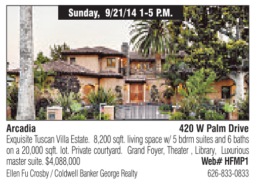 Sunday, 9/21/14 1-5 P.M. Arcadia 420 WPalm Drive Exquisite Tuscan Villa Estate. 8,200 sqft. living space w/ 5bdrm suites and 6baths on a20,000 sqft. lot. Private courtyard. Grand Foyer,Theater ,Library, Luxurious master suite. $4,088,000 Web# HFMP1 Ellen Fu Crosby /Coldwell Banker George Realty 626-833-0833