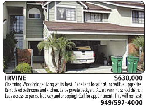 IRVINE $630,000 Charming Woodbridge living at its best. Excellent location! Incredible upgrades. Remodeledbathrooms andkitchen. Large privatebackyard. Awardwinningschool district. Easy access to parks, freeway andshopping! Call for appointment! This will notlast! 949/597-4000