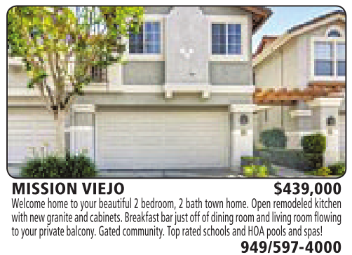MISSION VIEJO $439,000 Welcome home to your beautiful 2bedroom, 2bath town home. Open remodeled kitchen with new granite andcabinets. Breakfastbar just offofdiningroomand living room flowing to your private balcony.Gated community. Toprated schools andHOA pools andspas! 949/597-4000