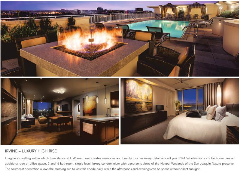 IRVINE – LUXURY HIGH RISE Imagine a dwelling within which time stands still. Where music creates memories and beauty touches every detail around you. 3144 Scholarship is a 2 bedroom plus an additional den or office space, 2 and ½ bathroom, single level, luxury condominium with panoramic views of the Natural Wetlands of the San Joaquin Nature preserve. The southeast orientation allows the morning sun to kiss this abode daily, while the afternoons and evenings can be spent without direct sunlight.