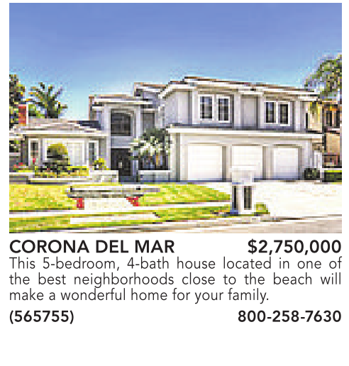 CORONA DEL MAR $2,750,000 This 5-bedroom, 4-bath house located in one of the best neighborhoods close to the beach will make a wonderful home for your family.