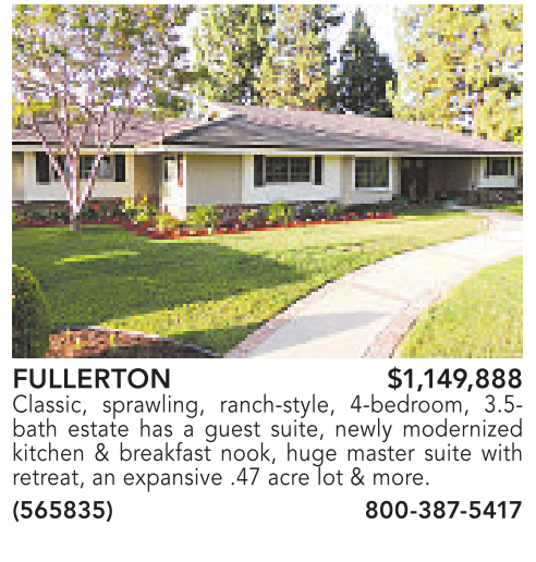 FULLERTON $1,149,888 Classic, sprawling, ranch-style, 4-bedroom, 3.5- bath estate has a guest suite, newly modernized kitchen & breakfast nook, huge master suite with retreat, an expansive .47 acre lot & more. (565835) 800-387-5417