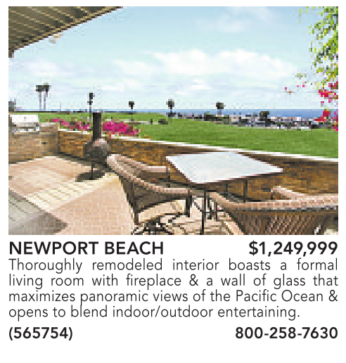 NEWPORT BEACH $1,249,999 Thoroughly remodeled interior boasts a formal living room with fireplace & a wall of glass that maximizes panoramic views of the Pacific Ocean & opens to blend indoor/outdoor entertaining. (565754) 800-258-7630