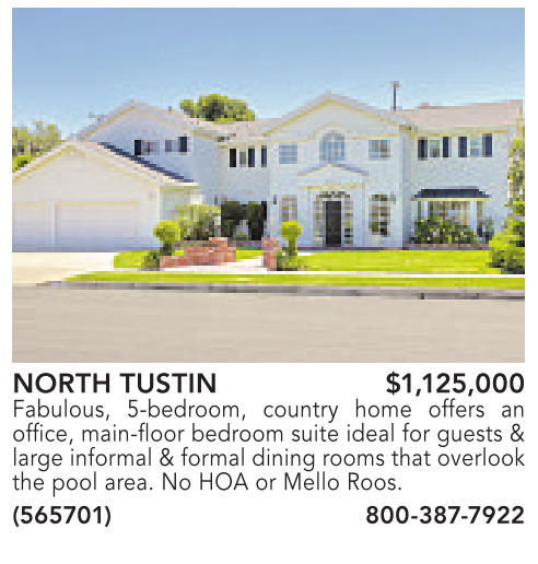 NORTH TUSTIN $1,125,000 Fabulous, 5-bedroom, country home offers an office, main-floor bedroom suite ideal for guests & large informal & formal dining rooms that overlook the pool area. No HOA or Mello Roos. (565701) 800-387-7922