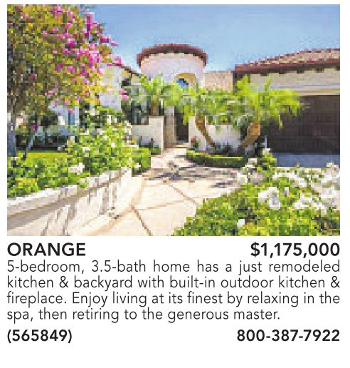 ORANGE $1,175,000 5-bedroom, 3.5-bath home has a just remodeled kitchen & backyard with built-in outdoor kitchen & fireplace. Enjoy living at its finest by relaxing in the spa, then retiring to the generous master. (565849) 800-387-7922