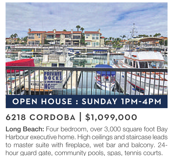 OPEN HOUSE : SUNDAY 1PM-4PM 6218 CORDOBA | $1,099,000 Long Beach: Four bedroom, over 3,000 square foot Bay Harbour executive home. High ceilings and staircase leads to master suite with fireplace, wet bar and balcony. 24- hour guard gate, community pools, spas, tennis courts.
