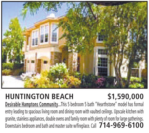 HUNTINGTON BEACH $1,590,000 Desirable Hamptons Community...This 5bedroom 5bath “Hearthstone” model has formal entry leading to spacious living room and dining room with vaulted ceilings. Upscale kitchen with granite,stainless appliances, double ovens andfamilyroomwithplentyofroomfor large gatherings. Downstairsbedroomand bath andmaster suite w/fireplace.Call 714-969-6100