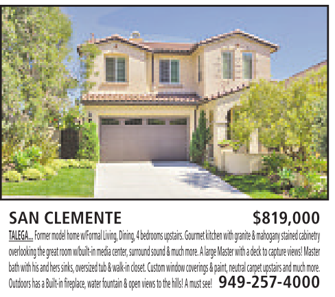 SAN CLEMENTE $819,000 TALEGA... Former model homew/Formal Living,Dining, 4bedrooms upstairs. Gourmet kitchen with granite &mahoganystained cabinetry overlooking thegreat room w/built-in mediacenter,surround sound &much more.Alarge Master with adecktocapture views! Master bath with his andherssinks,oversizedtub &walk-incloset.Customwindowcoverings&paint, neutral carpet upstairsand muchmore. Outdoorshas aBuilt-infireplace,waterfountain &open viewstothe hills!Amust see! 949-257-4000