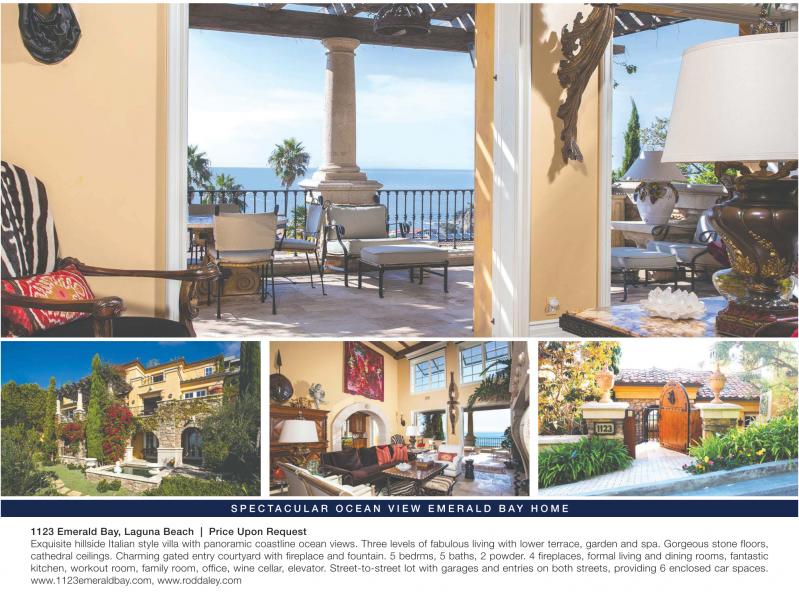 S P E C TA C U L A R O C E A N V I E W E M E R A L D B AY H O M E 1123 Emerald Bay, Laguna Beach | Price Upon Request Exquisite hillside Italian style villa with panoramic coastline ocean views. Three levels of fabulous living with lower terrace, garden and spa. Gorgeous stone floors, cathedral ceilings. Charming gated entry courtyard with fireplace and fountain. 5 bedrms, 5 baths, 2 powder. 4 fireplaces, formal living and dining rooms, fantastic kitchen, workout room, family room, office, wine cellar, elevator. Street-to-street lot with garages and entries on both streets, providing 6 enclosed car spaces. www.1123emeraldbay.com, www.roddaley.com