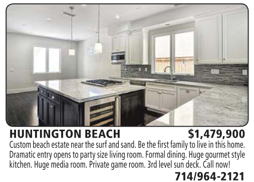 HUNTINGTON BEACH $1,479,900 Custom beach estate near the surf and sand. Be the first family to live in this home. Dramatic entry opens to party size living room. Formal dining. Huge gourmet style kitchen. Huge media room. Private game room. 3rd level sun deck. Call now! 714/964-2121 See also