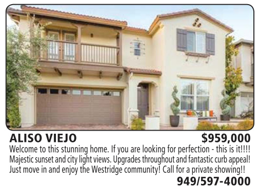 ALISO VIEJO $959,000 Welcome to this stunning home. If you are looking for perfection - this is it!!!! Majestic sunset and city light views. Upgrades throughout and fantastic curb appeal! Just move in and enjoy the Westridge community! Call for a private showing!!