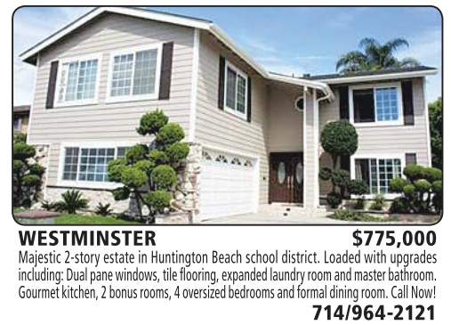 WESTMINSTER $775,000 Majestic 2-story estate in Huntington Beach school district. Loaded with upgrades including: Dual pane windows, tile flooring, expanded laundry room and master bathroom. Gourmet kitchen, 2 bonus rooms, 4 oversized bedrooms and formal dining room. Call Now!