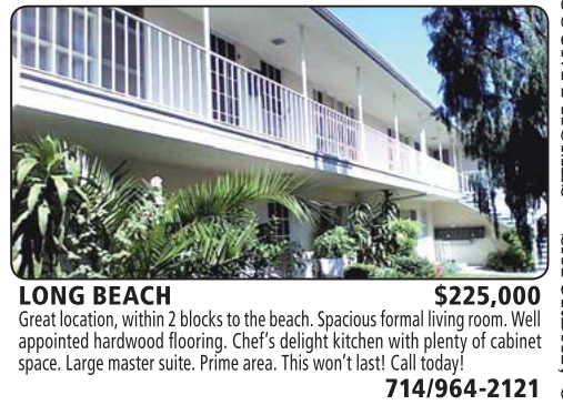 LONG BEACH $225,000 Great location, within 2 blocks to the beach. Spacious formal living room. Well appointed hardwood fl ooring. Chef’s delight kitchen with plenty of cabinet space. Large master suite. Prime area. This won’t last! Call today! 714/964-2121 See also