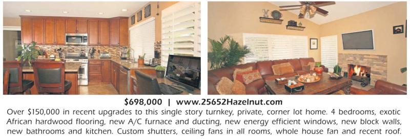 $698,000 | www.25652Hazelnut.com Over $150,000 in recent upgrades to this single story turnkey, private, corner lot home. 4 bedrooms, exotic African hardwood flooring, new A/C furnace and ducting, new energy efficient windows, new block walls, new bathrooms and kitchen. Custom shutters, ceiling fans in all rooms, whole house fan and recent roof.