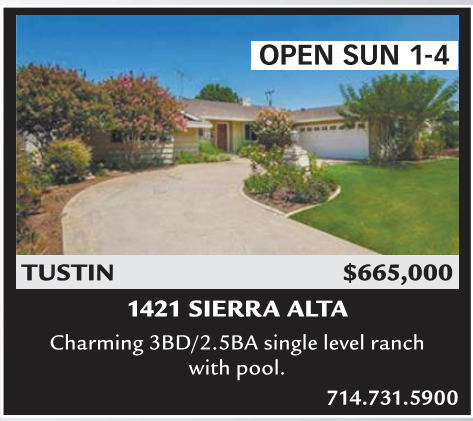 TUSTIN $665,000 1421 SIERRA ALTA Charming 3BD/2.5BA single level ranch with pool.