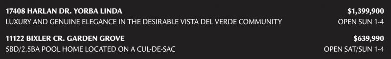 17408 HARLAN DR. YORBA LINDA $1,399,900 LUXURY AND GENUINE ELEGANCE IN THE DESIRABLE VISTA DEL VERDE COMMUNITY OPEN SUN 1-4 11122 BIXLER CR. GARDEN GROVE $639,990 5BD/2.5BA POOL HOME LOCATED ON A CUL-DE-SAC OPEN SAT/SUN 1-4