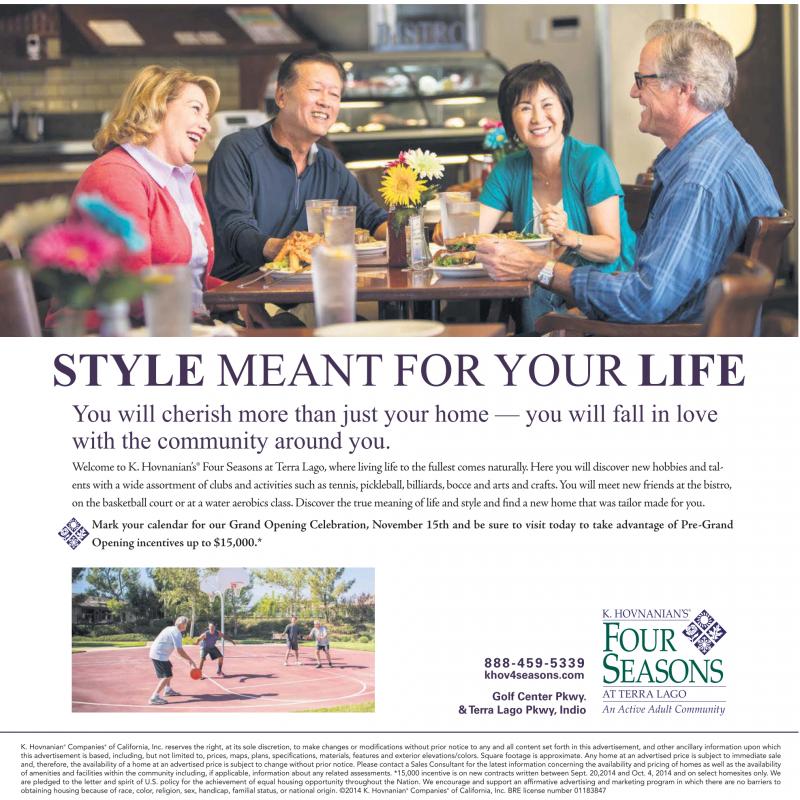 K. Hovnanian® Companies® of California, Inc. reserves the right, at its sole discretion, to make changes or modifications without prior notice to any and all content set forth in this advertisement, and other ancillary information upon which this advertisement is based, including, but not limited to, prices, maps, plans, specifications, materials, features and exterior elevations/colors. Square footage is approximate. Any home at an advertised price is subject to immediate sale and, therefore, the availability of a home at an advertised price is subject to change without prior notice. Please contact a Sales Consultant for the latest information concerning the availability and pricing of homes as well as the availability of amenities and facilities within the community including, if applicable, information about any related assessments. *15,000 incentive is on new contracts written between Sept. 20,2014 and Oct. 4, 2014 and on select homesites only. We are pledged to the letter and spirit of U.S. policy for the achievement of equal housing opportunity throughout the Nation. We encourage and support an affirmative advertising and marketing program in which there are no barriers to obtaining housing because of race, color, religion, sex, handicap, familial status, or national origin. ©2014 K. Hovnanian® Companies® of California, Inc. BRE license number 01183847