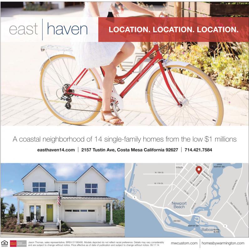 Jason Thomas, sales representative, BRE# 01166495. Models depicted do not reflect racial preference. Details may vary considerably and are subject to change without notice. Price effective as of date of publication and subject to change without notice. 09.17.14 LOCATION. LOCATION. LOCATION. A coastal neighborhood of 14 single-family homes from the low $1 millions easthaven14.com | 2157 Tustin Ave, Costa Mesa California 92627 | 714.421.7584 1 W. 19th St. W. Bay St. Newport Beach LIDO ISLE mwcustom.com NEWPORT BAY Balboa UPPER NEWPORT BAY BALBOA ISLAND homesbywarmington.com 1