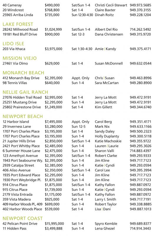 12 Harbor Island $7,495,000 Appt. Only Carol Berg 949.351.4171 29 Inverness Lane $3,280,000 Sun 12-5 Mark Nix 949.633.1166 1707 Port Charles Place $3,195,000 Sat 1-4 Sandy Daley 949.500.2323 1707 Port Charles Place $3,195,000 Sun 1-4 Holly Duplanty 949.300.5118 21 Jupiter Hills Drive $2,850,000 Sat/Sun 1-4 Katie Machoskie 949.355.9722 2421 Port Whitby Place $2,485,000 Sun 1-4 Lauren | Laurie 949.295.3026 6 Summer House Lane $2,475,000 Sun 1-4 Sharon Valli 714.883.4397 123 Amethyst Avenue $2,395,000 Sat/Sun 1-4 Robert Clarke 949.293.9333 1943 Port Seabourne Wy. $2,395,000 Sun 1-4 Jim Kline 949.717.7123 2939 Catalpa Street $2,385,000 Sun 1-4 Katie | Cyndi 949.293.0594 406 Aliso Avenue $2,350,000 Sat/Sun 1-4 Carol Lee 949.395.3994 1935 Port Edward Place $2,295,000 Sun 1-4 Jim Kline 949.717.7123 1930 Port Weybridge Pl. $1,875,000 Sun 1-4 Jim Kline 949.717.7123 914 Citrus Place $1,875,000 Sat/Sun 1-4 Kathy Fallon 949.887.0972 915 Citrus Place $1,739,000 Sun 1-4 Katie | Cyndi 949.293.0594 2179 Vista Entrada $1,175,000 Sat/Sun 1-4 Kathy Fallon 949.887.0972 359 Vista Madera $925,000 Sat 1-4 Larry I. Smith 949.717.7191 409 Harbor Woods Pl., 409 $699,000 Sun 1-4 Robert Taylor 949.338.8885 402 Harbor Woods Place $539,000 Sat 1-4 Lisa | Dani 949.887.1013