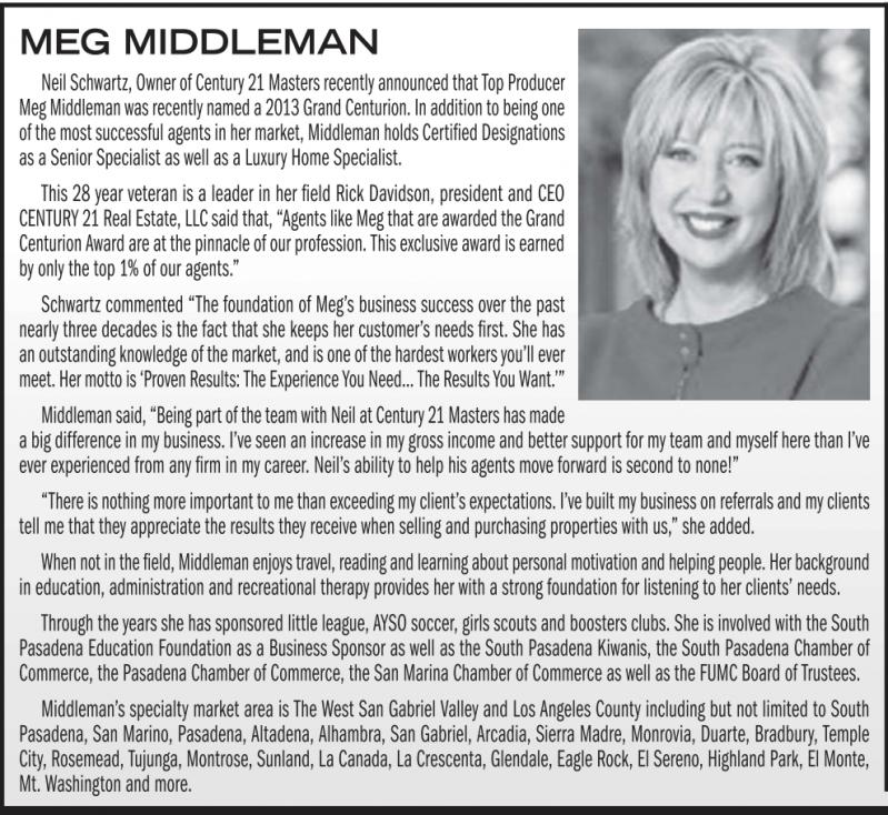 Neil Schwartz, Owner of Century 21 Masters recently announced that Top Producer Meg Middleman was recently named a 2013 Grand Centurion. In addition to being one of the most successful agents in her market, Middleman holds Certifi ed Designations as a Senior Specialist as well as a Luxury Home Specialist.